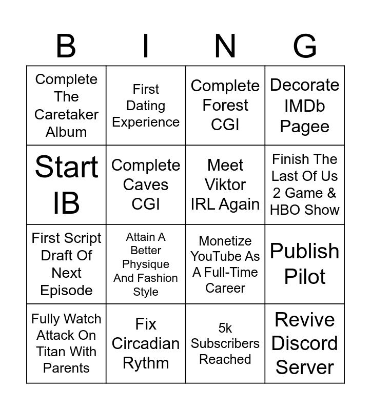 This bingo card has 16 words: Fix Circadian Rythm, Publish Pilot, Complete Forest CGI, Complete The Caretaker Album, First Script Draft Of Next Episode, First Dating Experience, Monetize YouTube As A Full-Time Career, 5k Subscribers Reached, Start IB, Complete Caves CGI, Fully Watch Attack On Titan With Parents, Decorate IMDb Pagee, Attain A Better Physique And Fashion Style, Finish The Last Of Us 2 Game & HBO Show, Meet Viktor IRL Again and Revive Discord Server.