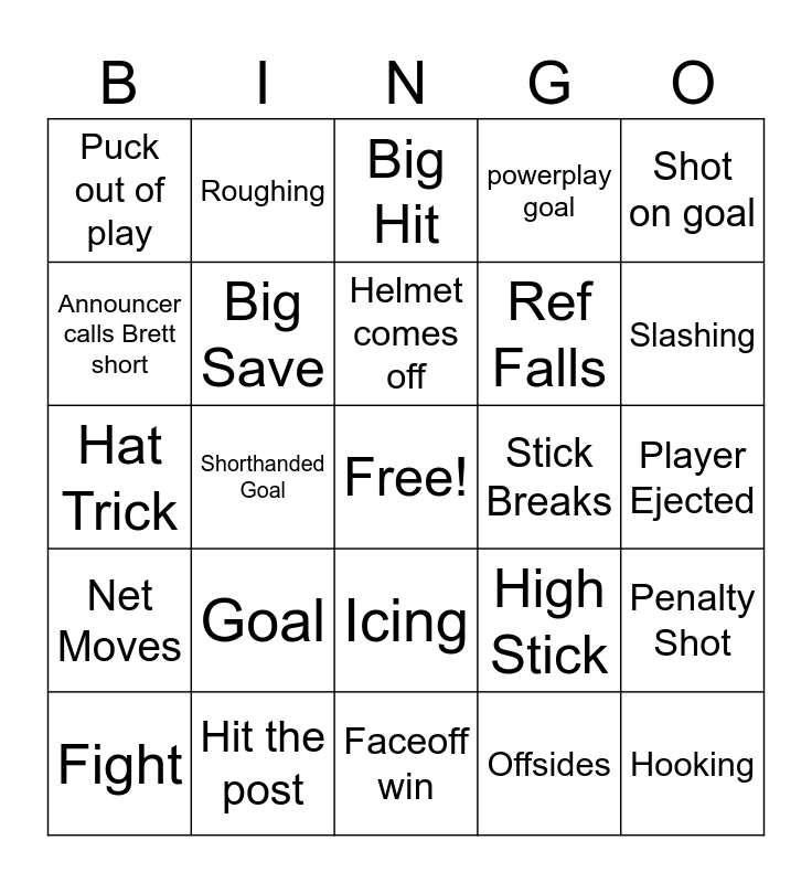 This bingo card has a free space and 24 words: Goal, Hit the post, Helmet comes off, Fight, Shot on goal, Puck out of play, Announcer calls Brett short, Roughing, Stick Breaks, Icing, Ref Falls, Hat Trick, High Stick, Penalty Shot, Big Save, Offsides, Player Ejected, Big Hit, Slashing, Shorthanded Goal, Hooking, Net Moves, powerplay goal and Faceoff win.