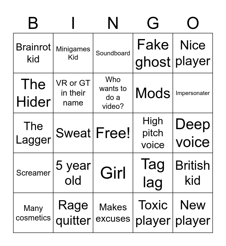 This bingo card has a free space and 24 words: 5 year old, Rage quitter, Who wants to do a video?, Many cosmetics, Nice player, Brainrot kid, The Hider, Minigames Kid, High pitch voice, Girl, Mods, The Lagger, Tag lag, British kid, VR or GT in their name, Toxic player, Deep voice, Soundboard, Impersonater, Sweat, New player, Screamer, Fake ghost and Makes excuses.