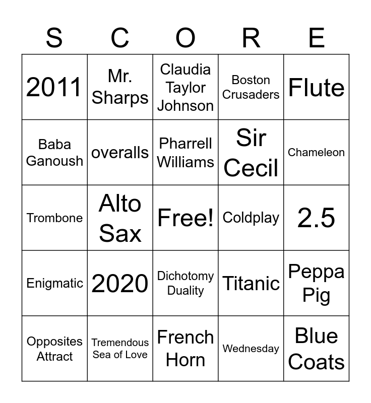This bingo card has a free space and 49 words: Bloom: The Beginning of Always, Blue Coats, Mattt the Cat, French Horn, 2020, 2008, Mr. Sharps, 2014, Baba Ganoush, Clarinet, overalls, Boston Crusaders, Peppa Pig, Titanic, Student Care of Resources and Equipment, Orchestra & AP Music Theory, Pharrell Williams, Coldplay, Jacob Collier, Flute, Alto Sax, Wednesday, 2011, Sir Cecil, Kiss From a Rose, Chameleon, Opposites Attract, Lincolnshire Posy, Dichotomy Duality, Enigmatic, Eve, White Rabbit, Flashdance, Forest Through the Trees, Tremendous Sea of Love, Circle of Life, Out There, Flamingo, 2.5, 2018, Conrad Eisenhower, Algorithm, Mr. Dixon, Fun & Mental, Trombone, Claudia Taylor Johnson, Del Rio, Battle Of The Bands 2023 and 96.6.