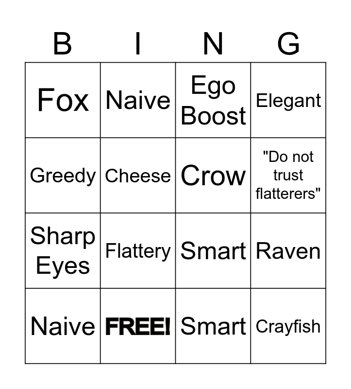 This bingo card has 25 words: Cunning, Selfish, "Do not trust flatterers", Raven, Greedy, Fox, Cheese, Naive, FREE!, Trickster, Sharp Eyes, Smart, Charming, Hungry, Crow, Flattery, Smart, Ego Boost, Flattery, Raven, Naive, Mouthwatering Cheese, Crayfish, Elegant and Fox.