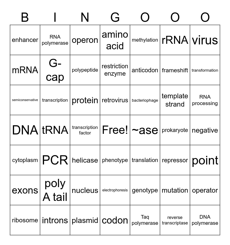 This bingo card has a free space and 48 words: genotype, frameshift, codon, tRNA, protein, negative, RNA polymerase, introns, rRNA, phenotype, virus, amino acid, template strand, bacteriophage, exons, prokaryote, mRNA, transformation, mutation, methylation, anticodon, transcription factor, enhancer, G-cap, operator, polypeptide, RNA processing, ribosome, retrovirus, transcription, reverse transcriptase, ~ase, point, poly A tail, DNA, translation, repressor, semiconservative, helicase, nucleus, cytoplasm, DNA polymerase, operon, plasmid, restriction enzyme, electrophoresis, PCR and Taq polymerase.