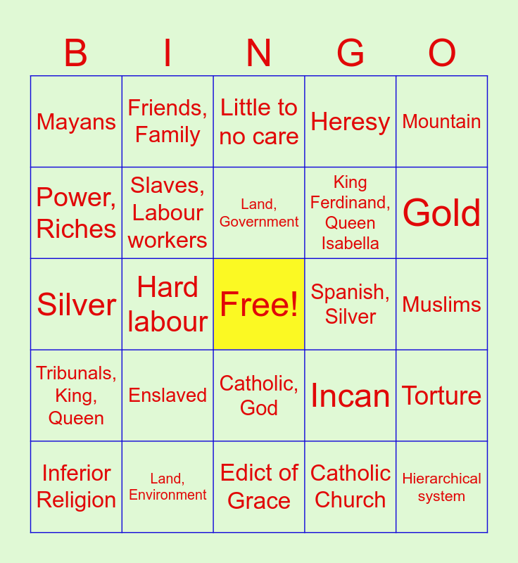 This bingo card has a free space and 24 words: Inferior Religion, Enslaved, Land, Government, Catholic Church, Mountain, Mayans, Friends, Family, Little to no care, Spanish, Silver, Muslims, Silver, Slaves, Labour workers, Incan, Torture, Power, Riches, Land, Environment, Edict of Grace, Heresy, Gold, Tribunals, King, Queen, Hard labour, Catholic, God, King Ferdinand, Queen Isabella and Hierarchical system.