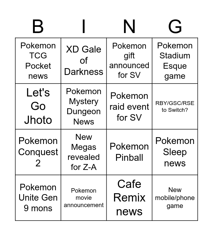 This bingo card has 30 words: Pokemon GO news, Pokemon Horizons stuff, Pokemon Sleep news, Pokemon Masters news, Pokemon TCG Pocket news, Pokemon gift announced for SV, Pokemon raid event for SV, Pokemon anime news, Pokemon movie announcement, 30th Anniversary mentioned at all, Cafe Remix news, Pokemon Unite Gen 9 mons, Legends Z-A gameplay, Starter revealed for Z-A, New Megas revealed for Z-A, Release date for Z-A revealed, New Charizard Form/Gimmick, New mobile/phone game, New console game, Let's Go Jhoto, Pokemon Pinball, Pokemon Collesseum, XD Gale of Darkness, Pokemon Conquest 2, Pokemon Mystery Dungeon News, Pokemon Stadium Esque game, Pokemon Trading Card Game 2, Pokemon Puzzle League / Puzzle Game, RBY/GSC/RSE to Switch? and Gen 10 teaser?.