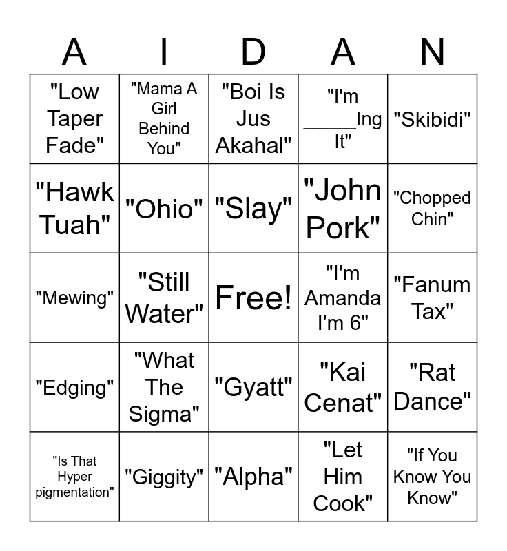 This bingo card has a free space and 24 words: "What The Sigma", "Giggity", "Slay", "Is That Hyper pigmentation", "Skibidi", "Low Taper Fade", "Hawk Tuah", "Mama A Girl Behind You", "I'm Amanda I'm 6", "Gyatt", "John Pork", "Mewing", "Kai Cenat", "Rat Dance", "Ohio", "Let Him Cook", "Fanum Tax", "Boi Is Jus Akahal", "Chopped Chin", "Still Water", "If You Know You Know", "Edging", "I'm _____Ing It" and "Alpha".