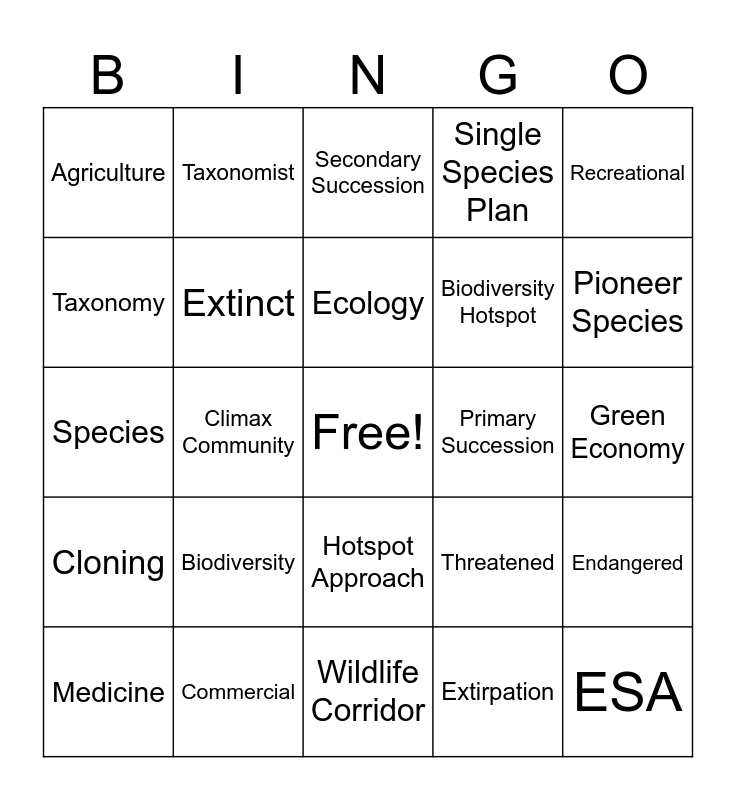 This bingo card has a free space and 24 words: Biodiversity, Commercial, Ecology, Medicine, Recreational, Agriculture, Taxonomy, Taxonomist, Primary Succession, Hotspot Approach, Biodiversity Hotspot, Species, Threatened, Endangered, Extinct, Extirpation, Green Economy, Secondary Succession, Pioneer Species, Climax Community, ESA, Cloning, Single Species Plan and Wildlife Corridor.