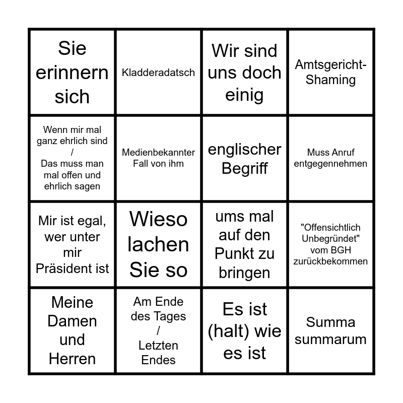 This bingo card has 16 words: Am Ende des Tages / Letzten Endes, "Offensichtlich Unbegründet" vom BGH zurückbekommen, Wir sind uns doch einig, Sie erinnern sich, Mir ist egal, wer unter mir Präsident ist, Kladderadatsch, ums mal auf den Punkt zu bringen, Es ist (halt) wie es ist, Wenn mir mal ganz ehrlich sind / Das muss man mal offen und ehrlich sagen, Medienbekannter Fall von ihm, Meine Damen und Herren, Amtsgericht-Shaming, Wieso lachen Sie so, Muss Anruf entgegennehmen, englischer Begriff and Summa summarum.