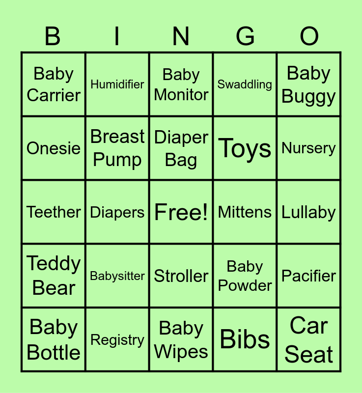 This bingo card has a free space and 24 words: Babysitter, Registry, Diaper Bag, Baby Bottle, Baby Buggy, Baby Carrier, Onesie, Humidifier, Mittens, Stroller, Toys, Teether, Baby Powder, Pacifier, Breast Pump, Bibs, Lullaby, Baby Monitor, Nursery, Diapers, Car Seat, Teddy Bear, Swaddling and Baby Wipes.