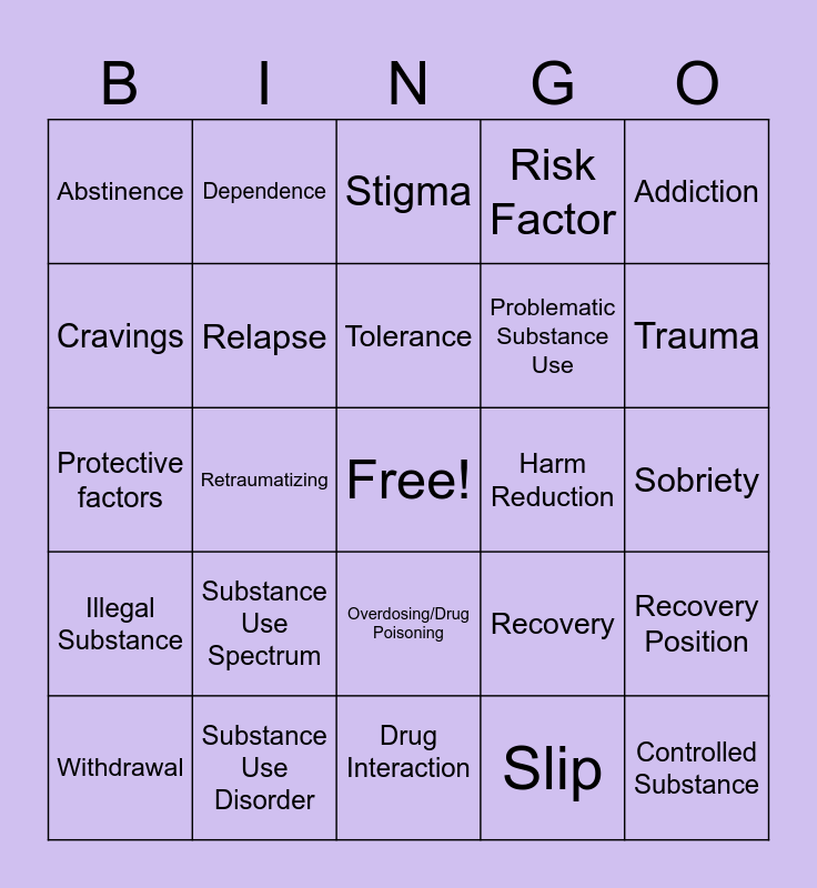 This bingo card has a free space and 24 words: Substance Use Spectrum, Substance Use Disorder, Tolerance, Withdrawal, Addiction, Abstinence, Cravings, Dependence, Harm Reduction, Overdosing/Drug Poisoning, Problematic Substance Use, Protective factors, Recovery, Recovery Position, Relapse, Slip, Sobriety, Stigma, Trauma, Retraumatizing, Controlled Substance, Illegal Substance, Risk Factor and Drug Interaction.