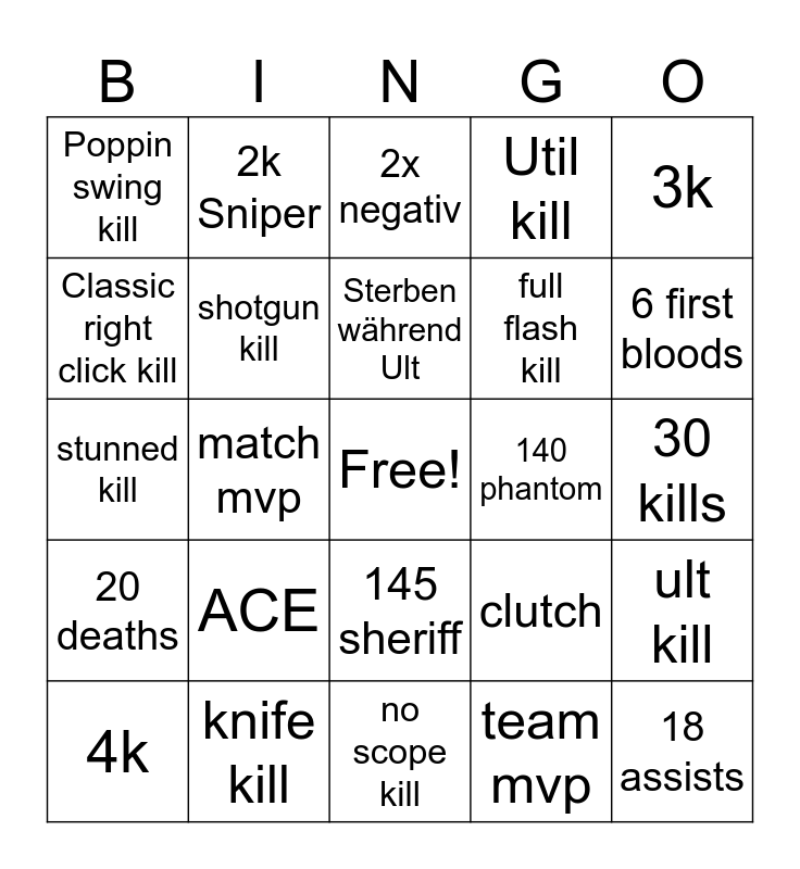 This bingo card has a free space and 24 words: ACE, knife kill, Sterben während Ult, 4k, 3k, Poppin swing kill, Classic right click kill, 2k Sniper, 140 phantom, 145 sheriff, full flash kill, stunned kill, clutch, ult kill, shotgun kill, team mvp, 30 kills, 2x negativ, 6 first bloods, match mvp, 18 assists, 20 deaths, Util kill and no scope kill.