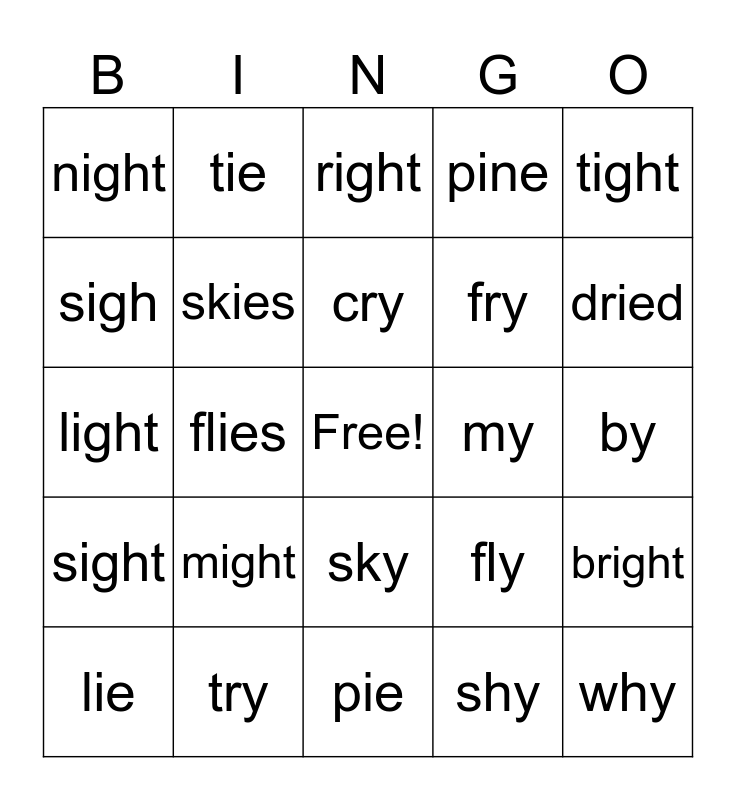 This bingo card has a free space and 24 words: might, try, cry, lie, tight, night, sigh, tie, my, sky, fry, light, fly, bright, skies, shy, by, right, dried, flies, why, sight, pine and pie.