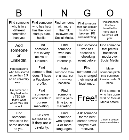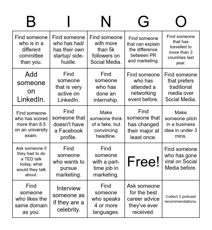 This bingo card has 25 words: Find someone who wants to pursue marketing., Find someone who speaks 4 or more languages., Find someone who has done an internship., Find someone who likes the same domain as you., Find someone that has travelled to more than 3 countries last year., Find someone who is in a different committee than you., Add someone on LinkedIn., Find someone who has had/ has their own startup/ side-hustle., Find someone that has changed their major at least once., Find someone with a part-time job in marketing., Find someone who has attended a networking event before., Find someone who has scored more than 8.5 on an university exam., Free!, Find someone who has gone viral on Social Media before., Find someone that is very active on LinkedIn., Collect 3 podcast recommendations., Make someone pitch in a business idea in under 3 mins., Find someone with more than 5k followers on Social Media., Find someone that prefers traditional media over Social Media., Find someone that doesn't have a Facebook profile., Make someone think of a fake, but convincing headline., Interview someone as if they are a celebrity., Ask someone if they had to do a TED talk today, what would they talk about., Find someone that can explain the difference between PR and marketing. and Ask someone for the best career advice they've ever received..