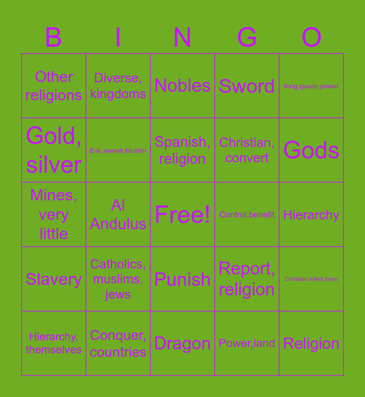This bingo card has a free space and 24 words: Catholics, muslims, jews, Conquer, countries, Spanish, religion, Hierarchy, themselves, King,queen,power, Other religions, Gold, silver, Diverse, kingdoms, Control,benefit, Punish, Christian, convert, Mines, very little, Report, religion, Christian,killed,force, Evil,Jewish,Muslim, Power,land, Hierarchy, Nobles, Gods, Al Andulus, Religion, Slavery, Sword and Dragon.