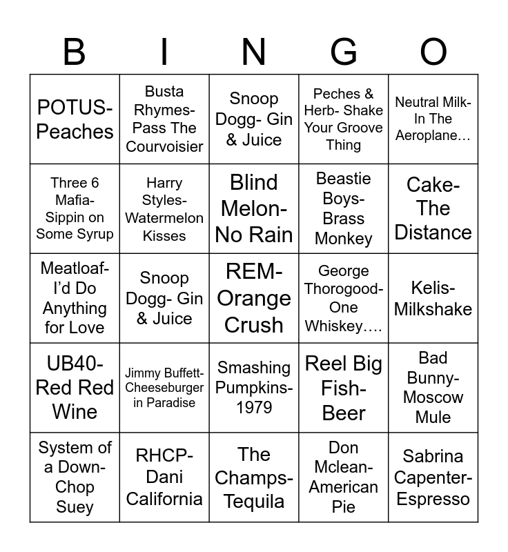 This bingo card has 27 words: Reel Big Fish- Beer, Sabrina Capenter- Espresso, Beastie Boys- Brass Monkey, The Champs- Tequila, Three 6 Mafia- Sippin on Some Syrup, Snoop Dogg- Gin & Juice, Busta Rhymes- Pass The Courvoisier, UB40- Red Red Wine, George Thorogood- One Whiskey…., Bad Bunny- Moscow Mule, Meatloaf- I’d Do Anything for Love, Peches & Herb- Shake Your Groove Thing, System of a Down- Chop Suey, RHCP- Dani California, Cake- The Distance, The Cranberries- Dreams, Harry Styles- Watermelon Kisses, Blind Melon- No Rain, Jimmy Buffett- Cheeseburger in Paradise, POTUS- Peaches, Kelis- Milkshake, Don Mclean- American Pie, Snoop Dogg- Gin & Juice, REM- Orange Crush, Smashing Pumpkins- 1979, Neutral Milk- In The Aeroplane… and Rupert Holmes- Escape (The Pina Colada Song).