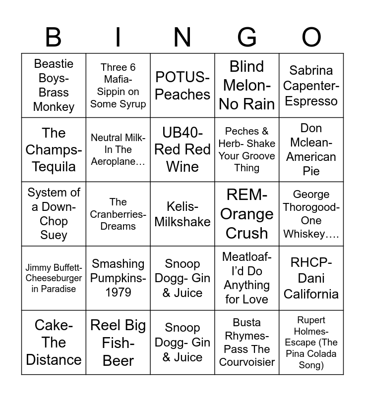 This bingo card has 26 words: Snoop Dogg- Gin & Juice, Busta Rhymes- Pass The Courvoisier, UB40- Red Red Wine, Reel Big Fish- Beer, Sabrina Capenter- Espresso, Beastie Boys- Brass Monkey, The Champs- Tequila, Three 6 Mafia- Sippin on Some Syrup, George Thorogood- One Whiskey…., Meatloaf- I’d Do Anything for Love, Peches & Herb- Shake Your Groove Thing, System of a Down- Chop Suey, RHCP- Dani California, Cake- The Distance, The Cranberries- Dreams, Harry Styles- Watermelon Kisses, Blind Melon- No Rain, Jimmy Buffett- Cheeseburger in Paradise, POTUS- Peaches, Kelis- Milkshake, Don Mclean- American Pie, Snoop Dogg- Gin & Juice, REM- Orange Crush, Smashing Pumpkins- 1979, Neutral Milk- In The Aeroplane… and Rupert Holmes- Escape (The Pina Colada Song).