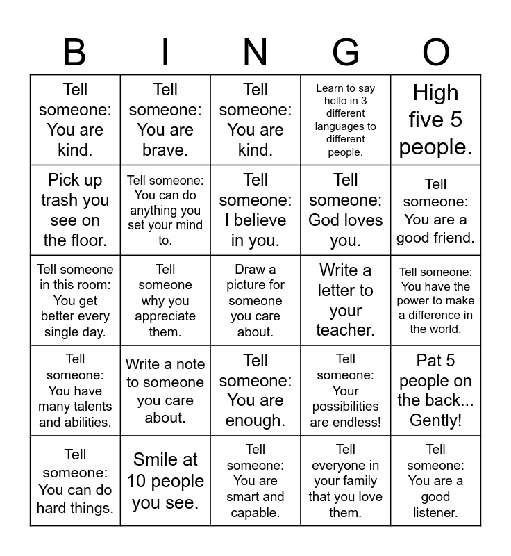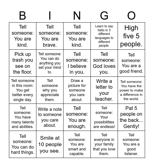 This bingo card has a free space and 24 words: Write a note to someone you care about., Smile at 10 people you see., Tell someone: I believe in you., Tell someone: You can do hard things., High five 5 people., Tell someone: You are kind., Pick up trash you see on the floor., Tell someone: You are brave., Write a letter to your teacher., Tell someone: You are enough., Tell someone: God loves you., Tell someone in this room: You get better every single day., Tell someone: Your possibilities are endless!, Pat 5 people on the back... Gently!, Tell someone: You can do anything you set your mind to., Tell everyone in your family that you love them., Tell someone: You have the power to make a difference in the world., Tell someone: You are kind., Tell someone: You are a good friend., Tell someone why you appreciate them., Tell someone: You are a good listener., Tell someone: You have many talents and abilities., Learn to say hello in 3 different languages to different people. and Tell someone: You are smart and capable..