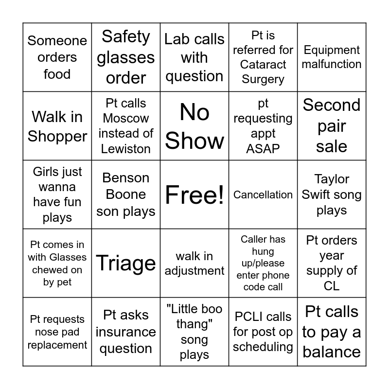 This bingo card has a free space and 24 words: Triage, Pt asks insurance question, No Show, Pt requests nose pad replacement, Equipment malfunction, Someone orders food, Walk in Shopper, Safety glasses order, Cancellation, walk in adjustment, pt requesting appt ASAP, Girls just wanna have fun plays, Caller has hung up/please enter phone code call, Pt orders year supply of CL, Pt calls Moscow instead of Lewiston, PCLI calls for post op scheduling, Taylor Swift song plays, Lab calls with question, Second pair sale, Benson Boone son plays, Pt calls to pay a balance, Pt comes in with Glasses chewed on by pet, Pt is referred for Cataract Surgery and "Little boo thang" song plays.