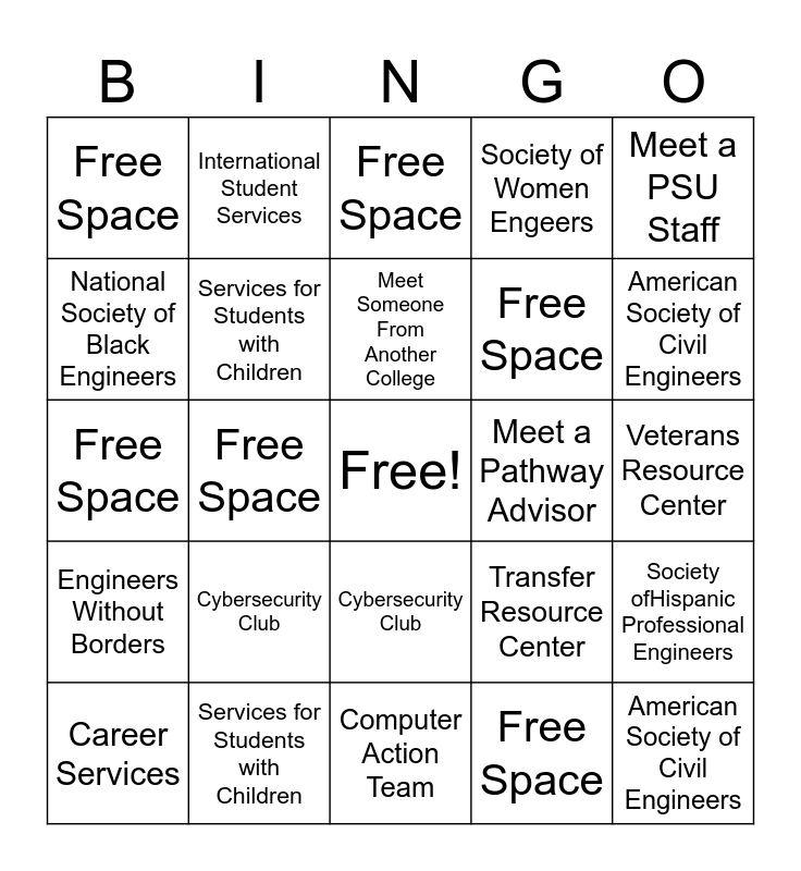 This bingo card has a free space and 49 words: American Indian Science & Engineering Society, American Society of Civil Engineers, Career Services, Computer Action Team, Cybersecurity Club, Engineers Without Borders, International Student Services, MECOP/CECOP, National Society of Black Engineers, Portland State Aerospace Society, Services for Students with Children, Society of Women Engeers, Society ofHispanic Professional Engineers, Transfer Resource Center, Veterans Resource Center, Viking Motor Sports, Meet Someone From Another College, Meet a Pathway Advisor, Meet Someone From Another Major, Meet a PSU Staff, Free Space, Free Space, Free Space, Free Space, American Indian Science & Engineering Society, American Society of Civil Engineers, Career Services, Computer Action Team, Cybersecurity Club, Engineers Without Borders, International Student Services, MECOP/CECOP, National Society of Black Engineers, Portland State Aerospace Society, Services for Students with Children, Society of Women Engeers, Society ofHispanic Professional Engineers, Transfer Resource Center, Veterans Resource Center, Viking Motor Sports, Meet Someone From Another College, Meet a Pathway Advisor, Meet Someone From Another Major, Meet a PSU Staff, Free Space, Free Space, Free Space, Free Space and Free Space.