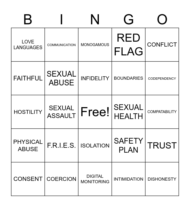 This bingo card has a free space and 29 words: CONSENT, LOVE, SEXUAL ASSAULT, SEXUAL HARASSMENT, LOVE LANGUAGES, MONOGAMOUS, SEXUAL ABUSE, F.R.I.E.S., SEXUAL HEALTH, COERCION, COMPATABILITY, DISHONESTY, DIGITAL MONITORING, INTIMIDATION, CODEPENDENCY, CONTROL, ISOLATION, PHYSICAL ABUSE, CONFLICT, HOSTILITY, SAFETY PLAN, JEALOUSY, BOUNDARIES, FAITHFUL, RED FLAG, COMMUNICATION, TRUST, INFIDELITY and BREADCRUMBING.