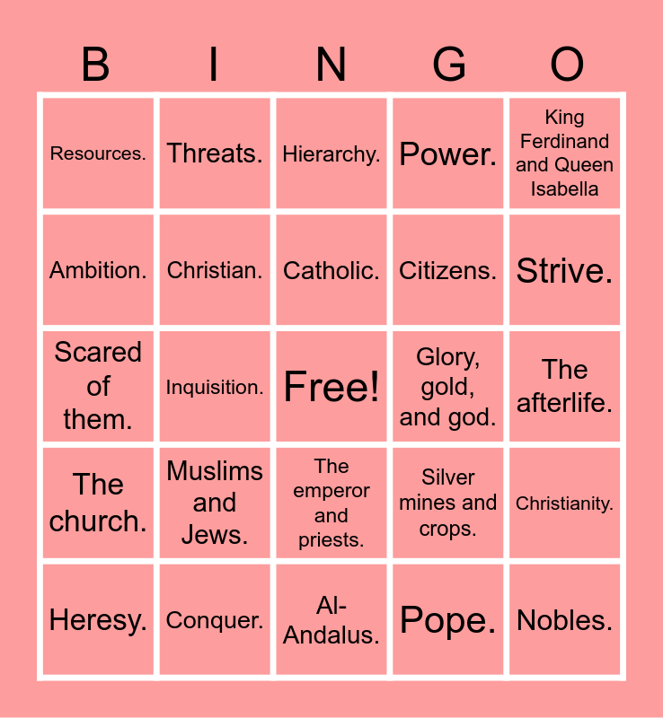 This bingo card has a free space and 24 words: Muslims and Jews., Conquer., Catholic., Heresy., King Ferdinand and Queen Isabella, Resources., Ambition., Threats., Glory, gold, and god., The emperor and priests., Citizens., Scared of them., Silver mines and crops., Christianity., Christian., Pope., The afterlife., Hierarchy., Strive., Inquisition., Nobles., The church., Power. and Al-Andalus..