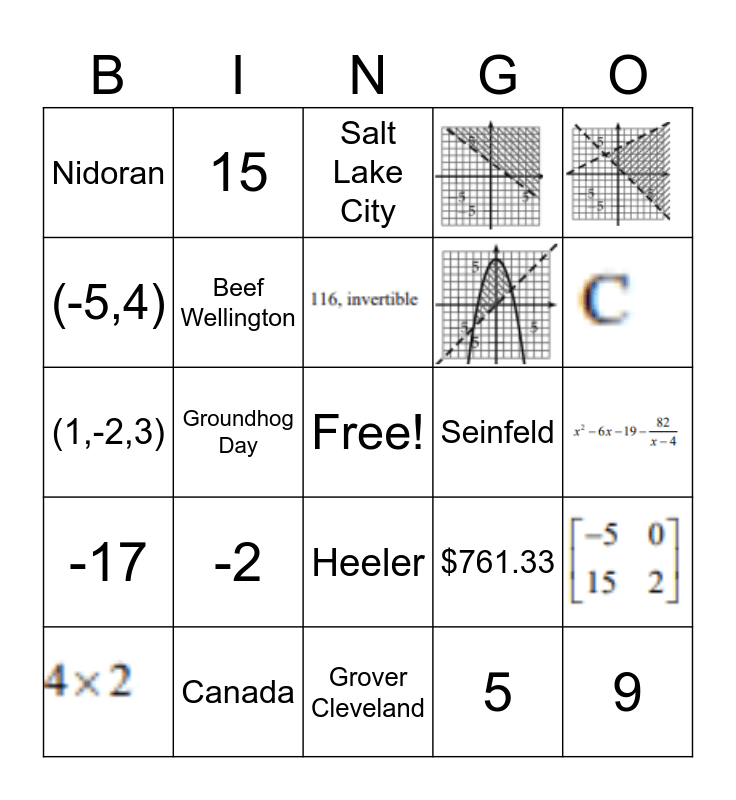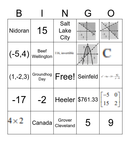 This bingo card has 9 images, a free space and 21 words: Canada, United States, Groundhog Day, Coach Toldson, Nidoran, Salt Lake City, Beef Wellington, Heeler, Seinfeld, Grover Cleveland, 9, 5, 0, 9, $761.33, -17, -2, (1,-2,3), Consistent, 15 and (-5,4).