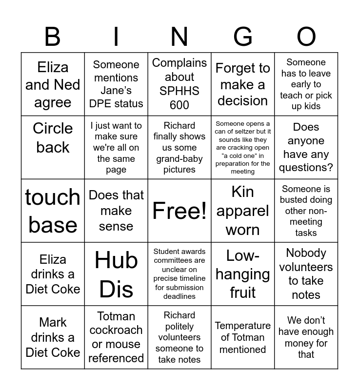 This bingo card has a free space and 25 words: Hub Dis, Richard politely volunteers someone to take notes, Richard finally shows us some grand-baby pictures, Mark drinks a Diet Coke, Someone has to leave early to teach or pick up kids, Eliza and Ned agree, Circle back, Someone mentions Jane’s DPE status, Kin apparel worn, Student awards committees are unclear on precise timeline for submission deadlines, Someone opens a can of seltzer but it sounds like they are cracking open “a cold one” in preparation for the meeting, touch base, Low-hanging fruit, Nobody volunteers to take notes, I just want to make sure we're all on the same page, Someone awkwardly claps when someone finishes speaking, Someone is busted doing other non-meeting tasks, Complains about SPHHS 600, Does anyone have any questions?, Does that make sense, We don’t have enough money for that, Totman cockroach or mouse referenced, Eliza drinks a Diet Coke, Forget to make a decision and Temperature of Totman mentioned.