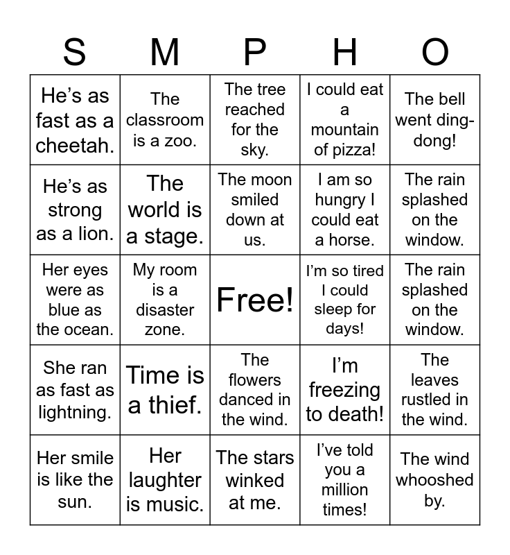 This bingo card has a free space and 24 words: Her smile is like the sun., Time is a thief., The moon smiled down at us., I’ve told you a million times!, The bell went ding-dong!, He’s as fast as a cheetah., The classroom is a zoo., The tree reached for the sky., I’m so tired I could sleep for days!, The rain splashed on the window., Her eyes were as blue as the ocean., The world is a stage., I’m freezing to death!, The leaves rustled in the wind., He’s as strong as a lion., Her laughter is music., The stars winked at me., I could eat a mountain of pizza!, The rain splashed on the window., She ran as fast as lightning., My room is a disaster zone., The flowers danced in the wind., I am so hungry I could eat a horse. and The wind whooshed by..