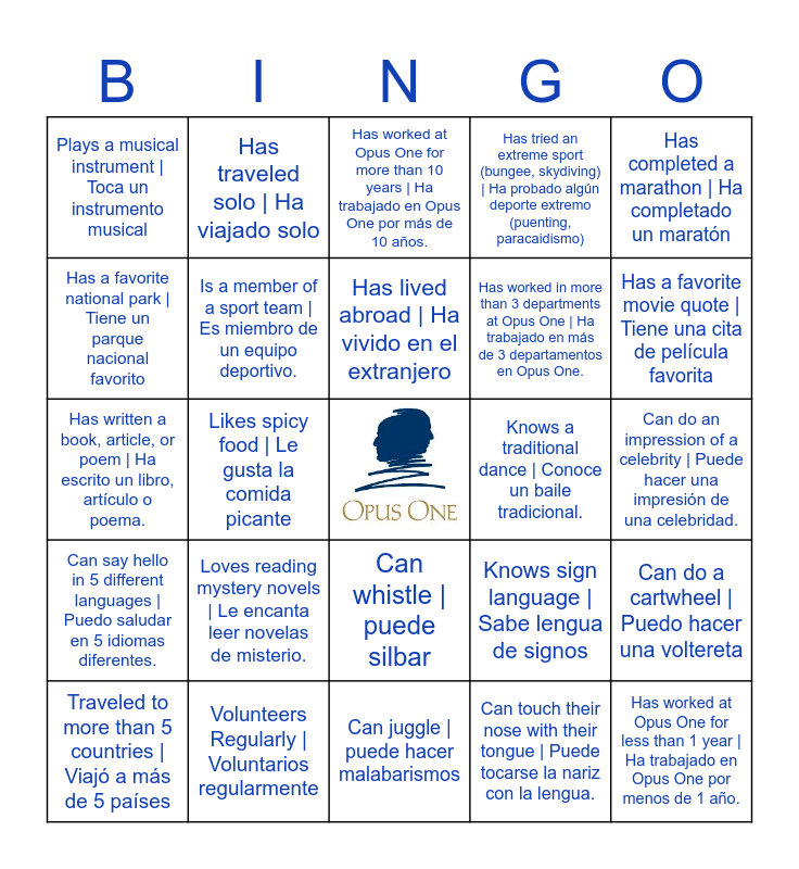 This bingo card has a free space and 29 words: Traveled to more than 5 countries | Viajó a más de 5 países, Speaks more than 2 languages | Habla más de 2 idiomas., Likes spicy food | Le gusta la comida picante, Has a pet | tiene una mascota, Plays a musical instrument | Toca un instrumento musical, Has worked at Opus One for more than 10 years | Ha trabajado en Opus One por más de 10 años., Is a member of a sport team | Es miembro de un equipo deportivo., Loves reading mystery novels | Le encanta leer novelas de misterio., Knows a traditional dance | Conoce un baile tradicional., Volunteers Regularly | Voluntarios regularmente, Can do an impression of a celebrity | Puede hacer una impresión de una celebridad., Has worked at Opus One for less than 1 year | Ha trabajado en Opus One por menos de 1 año., Can juggle | puede hacer malabarismos, Can touch their nose with their tongue | Puede tocarse la nariz con la lengua., Has a favorite movie quote | Tiene una cita de película favorita, Can wiggle their ears | Pueden mover las orejas, Can whistle | puede silbar, Can say hello in 5 different languages | Puedo saludar en 5 idiomas diferentes., Has completed a marathon | Ha completado un maratón, Has written a book, article, or poem | Ha escrito un libro, artículo o poema., Knows sign language | Sabe lengua de signos, Has gone scuba diving | Ha ido a bucear, Has worked in more than 3 departments at Opus One | Ha trabajado en más de 3 departamentos en Opus One., Has a favorite national park | Tiene un parque nacional favorito, Has tried an extreme sport (bungee, skydiving) | Ha probado algún deporte extremo (puenting, paracaidismo), Has traveled solo | Ha viajado solo, Can do a cartwheel | Puedo hacer una voltereta, Has lived abroad | Ha vivido en el extranjero and Loves sushi | le encanta el sushi.
