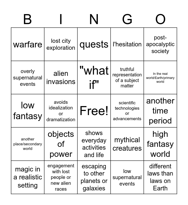 This bingo card has a free space and 24 words: magic in a realistic setting, objects of power, "what if", low supernatural events, post-apocalyptic society, warfare, lost city exploration, quests, scientific technologies or advancements, another time period, low fantasy, alien invasions, mythical creatures, high fantasy world, overly supernatural events, engagement with lost people or new alien races, escaping to other planets or galaxies, I'hesitation, In the real world/Earth/primary world, another place/secondary world, avoids idealization or dramatization, shows everyday activities and life, truthful representation of a subject matter and different laws than laws on Earth.