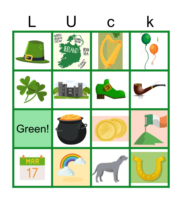This bingo card has 18 images and 2 words: Green! and March 17th.