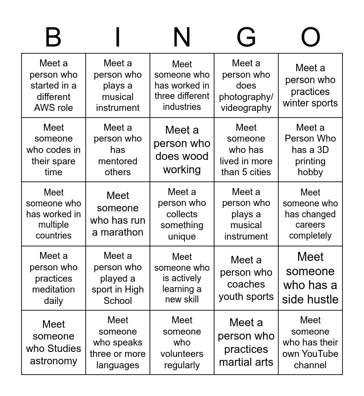 This bingo card has a free space and 24 words: Meet a person who played a sport in High School, Meet someone who speaks three or more languages, Meet a person who does wood working, Meet someone who Studies astronomy, Meet a person who practices winter sports, Meet a person who started in a different AWS role, Meet someone who codes in their spare time, Meet a person who plays a musical instrument, Meet a person who plays a musical instrument, Meet someone who is actively learning a new skill, Meet someone who has lived in more than 5 cities, Meet someone who has worked in multiple countries, Meet a person who coaches youth sports, Meet someone who has a side hustle, Meet a person who has mentored others, Meet a person who practices martial arts, Meet someone who has changed careers completely, Meet someone who has worked in three different industries, Meet a Person Who has a 3D printing hobby, Meet someone who has run a marathon, Meet someone who has their own YouTube channel, Meet a person who practices meditation daily, Meet a person who does photography/ videography and Meet someone who volunteers regularly.