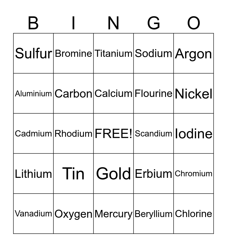 This bingo card has a free space and 59 words: Hydrogen, Oxygen, Helium, Lithium, Beryllium, Boron, Carbon, Nitrogen, Flourine, Neon, Sodium, Magnesium, Aluminium, Silicon, Phosphorus, Sulfur, Chlorine, Argon, Potassium, Calcium, Scandium, Titanium, Vanadium, Chromium, Barium, Manganese, Iron, Cobalt, Nickel, Copper, Zinc, Gallium, Arsenic, Selenium, Bromine, Krypton, Zirconium, Rhodium, Silver, Cadmium, Indium, Tin, Iodine, Xenon, Barium, Tungsten, Osmium, Platinum, Gold, Mercury, Lead, Bismuth, Radon, Radium, Europium, Erbium, Americium, Thorium and Uranium.