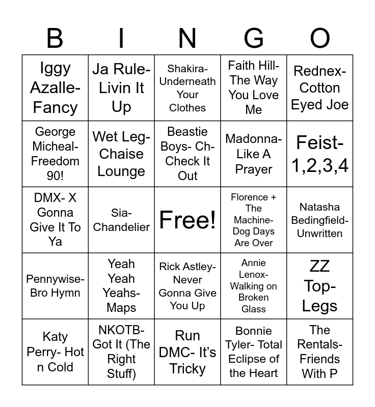 This bingo card has a free space and 31 words: Run DMC- It’s Tricky, Lorde- Royals, Sia- Chandelier, Divynls- Touch Myself, Iggy Azalle- Fancy, Shakira- Underneath Your Clothes, Wet Leg- Chaise Lounge, Annie Lenox- Walking on Broken Glass, Florence + The Machine- Dog Days Are Over, Bonnie Tyler- Total Eclipse of the Heart, Natasha Bedingfield- Unwritten, The Rentals- Friends With P, Rhianna- Run This Town, Nicki Minaj- Anaconda, Feist- 1,2,3,4, Nelly Furtado- I’m Like A Bird, ZZ Top- Legs, Yeah Yeah Yeahs- Maps, Pennywise- Bro Hymn, Rick Astley- Never Gonna Give You Up, Rednex- Cotton Eyed Joe, Sir Mix-A-Lot- Baby, Got Back, Katy Perry- Hot n Cold, Ja Rule- Livin It Up, Madonna- Like A Prayer, George Micheal- Freedom 90!, Faith Hill- The Way You Love Me, DMX- X Gonna Give It To Ya, NKOTB- Got It (The Right Stuff), Beastie Boys- Ch-Check It Out and Cheap Trick- I Want You To Want Me.