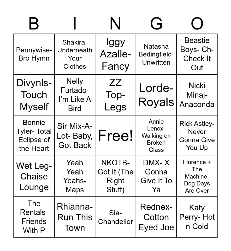 This bingo card has a free space and 27 words: DMX- X Gonna Give It To Ya, Run DMC- It’s Tricky, Lorde- Royals, Sia- Chandelier, Divynls- Touch Myself, Iggy Azalle- Fancy, Shakira- Underneath Your Clothes, Wet Leg- Chaise Lounge, Annie Lenox- Walking on Broken Glass, Florence + The Machine- Dog Days Are Over, Bonnie Tyler- Total Eclipse of the Heart, Natasha Bedingfield- Unwritten, The Rentals- Friends With P, Rhianna- Run This Town, Nicki Minaj- Anaconda, Feist- 1,2,3,4, Nelly Furtado- I’m Like A Bird, ZZ Top- Legs, Yeah Yeah Yeahs- Maps, Pennywise- Bro Hymn, Rick Astley- Never Gonna Give You Up, Rednex- Cotton Eyed Joe, Sir Mix-A-Lot- Baby, Got Back, Katy Perry- Hot n Cold, NKOTB- Got It (The Right Stuff), Beastie Boys- Ch-Check It Out and Cheap Trick- I Want You To Want Me.