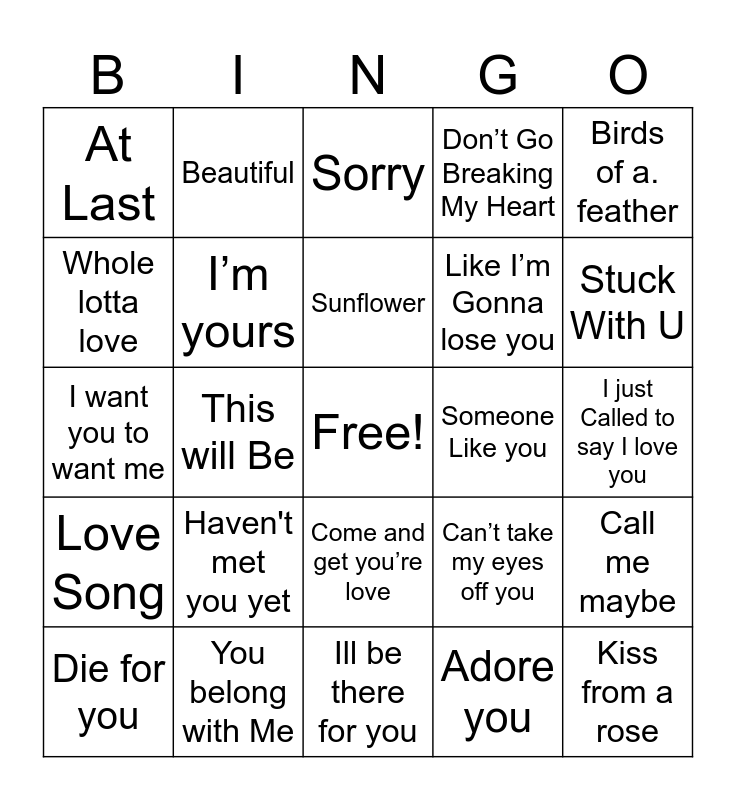 This bingo card has a free space and 58 words: Nothing Breaks Like a Heart, You belong with Me, My Life would Suck Without you, Love Song, Adore you, Dear Future Husband, I’m yours, Just the way you are, Like I’m Gonna lose you, There’s Nothing Holding me Back, Don’t Go Breaking My Heart, L-O-V-E, Love, Until I found you, If i ain’t Got you, At Last, Kiss from a rose, Birds of a. feather, Love on Top, Sunflower, Someone Like you, Sorry, Die for you, Call me maybe, Shape of you, I just Called to say I love you, You’re the first the last my everything, Lil Boo Thang, Stuck With U, My girl, Always be My baby, A thousand miles, For once in my life, That’s Amore, Happy together, Say hey, Accidentally in love, This will Be, I want you to want me, 10,000 Hours, Haven't met you yet, Lucky, Can’t take my eyes off you, Memories, Love Grows, Youre the one that I want, Every breathe you take, Come and get you’re love, Ill be there for you, You can’t hurry love, One call away, I like me better, I wanna dance with somebody, What makes you beautiful, Beautiful, Do you love me, Whole lotta love and Something’s Got a Hold on me.