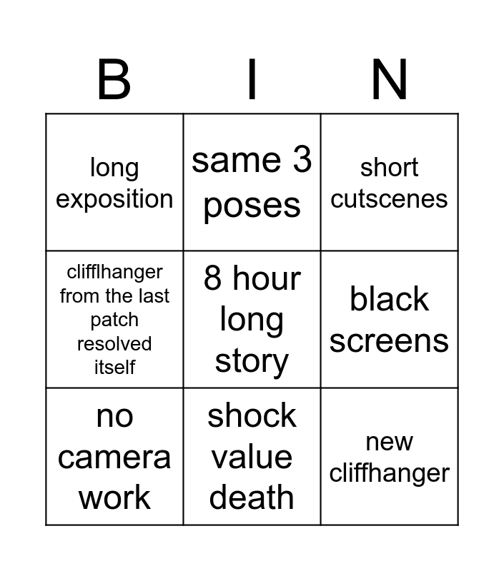 This bingo card has a free space and 8 words: black screens, short cutscenes, same 3 poses, no camera work, long exposition, new cliffhanger, clifflhanger from the last patch resolved itself and shock value death.