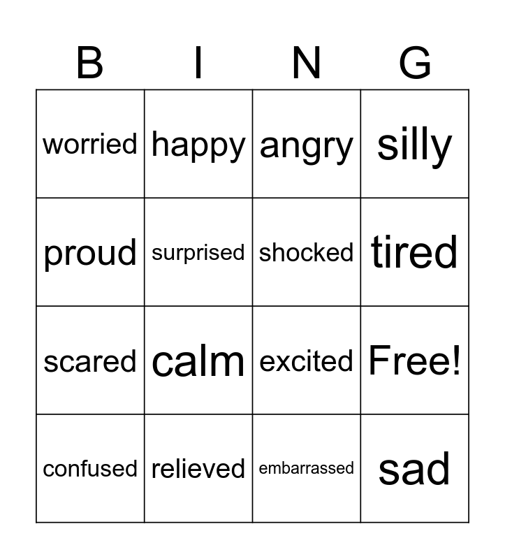 This bingo card has 20 words: Free!, upset, angry, surprised, confused, proud, relieved, worried, scared, happy, calm, excited, surprised, sad, shocked, confident, tired, silly, embarrassed and amazed.