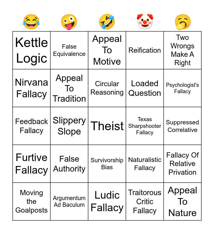 This bingo card has a free space and 98 words: Argument from Incredulity, Argument to Moderation, Continuum Fallacy, Suppressed Correlative, Definist Fallacy, Divine Fallacy, Double Counting, Equivocation, Ecological Fallacy, Etymological Fallacy, Fallacy of Composition, Fallacy of Division, False Attribution, False Authority, False Dilemma, False Equivalence, Feedback Fallacy, Historian's Fallacy, Historical Fallacy, Baconian Fallacy, Homunculus Fallacy, Inflation of Conflict, If-by-whiskey, Incomplete Comparison, Intentionality Fallacy, Kettle Logic, Ludic Fallacy, McNamara Fallacy, Mind Projection Fallacy, Moralistic Fallacy, Moving the Goalposts, Nirvana Fallacy, Package Deal, Proving Too Much, Psychologist's Fallacy, Referential Fallacy, Reification, Retrospective Determinism, Slippery Slope, Special Pleading, Begging the Question, Circular Reasoning, Loaded Question, Appeal to Purity, Cherry Picking, Survivorship Bias, False Analogy, Hasty Generalization, Anecdotal Argument, Misleading Vividness, Overwhelming Exception, Thought-Terminating Cliché, Post hoc ergo propter hoc, Reverse Causation, Ignoring Common Cause, Single Cause Fallacy, Furtive Fallacy, Magical Thinking, Observational Interpretation Fallacy, Regression Fallacy, Gambler's Fallacy, Sunk Costs Fallacy, Appeal To The Stone, Invincible Ignorance, Argument From Ignorance, Argument From Silence, Ignoratio Elenchi, Ad Hominem, Circumstantial Ad Hominem, Poisoning The Well, Appeal To Motive, Tone Policing, Traitorous Critic Fallacy, Bulverism, Appeal To Authority, Appeal To Accomplishment, Courtier's Reply, Appeal To Consequences, Appeal To Emotion, Appeal To Nature, Appeal To Novelty, Appeal To Tradition, Argumentum Ad Baculum, Argumentum Ad Populum, Association Fallacy, Logic Chopping Fallacy, Ipse Dixit, Chronological Snobbery, Fallacy Of Relative Privation, Genetic Fallacy, I'm Entitled To My Opinion, Naturalistic Fallacy, Is–ought Fallacy, Straw Man Fallacy, Texas Sharpshooter Fallacy, Tu Quoque, Two Wrongs Make A Right and Vacuous Truth.