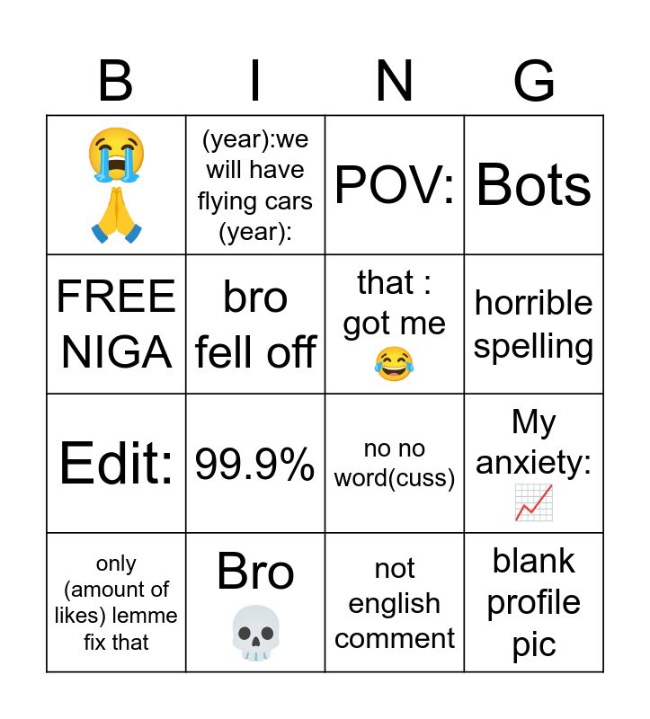 This bingo card has 16 words: Broπ, My anxiety:π, POV:, ππ, Edit:, (year):we will have flying cars (year):, no no word(cuss), not english comment, FREE NIGA, bro fell off, only (amount of likes) lemme fix that, Bots, 99.9%, horrible spelling, that : got meπ and blank profile pic.