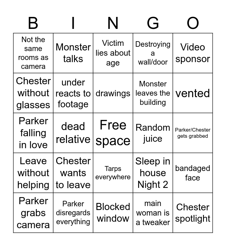 This bingo card has a free space and 54 words: Parker touching hands, Leave without helping, Microwave cam, Triple lamp, Tarps everywhere, Random familiar, Destroying a wall/door, Camera in your room?, Chester without glasses, Weird front door, Not the same rooms as camera, Missing camera angle, Parker disregards everything, Parker grabs camera, Main woman dies/missing, Blocked window, Chester spotlight, Monster leaves the building, Random animal, Parker/Chester gets grabbed, Sleep in house Night 2, Skip camera footage, Random juice, Video sponsor, 18 yo girl, Monster talks, time stamps make no sense, no one hears yelling, shitty text message, main woman is a tweaker, Repair damaged property, wizardly activity, monster hits jig, All lights off, Victim lies about age, Locked room, Parker falling in love, bandaged face, left behind camera, under reacts to footage, over reacts to footage, shitty house, share bed, basement, Chester wants to leave, white nightgown, outburst, massive house, drawings, dead relative, vented, teleported, mouth breather and monster head bang.