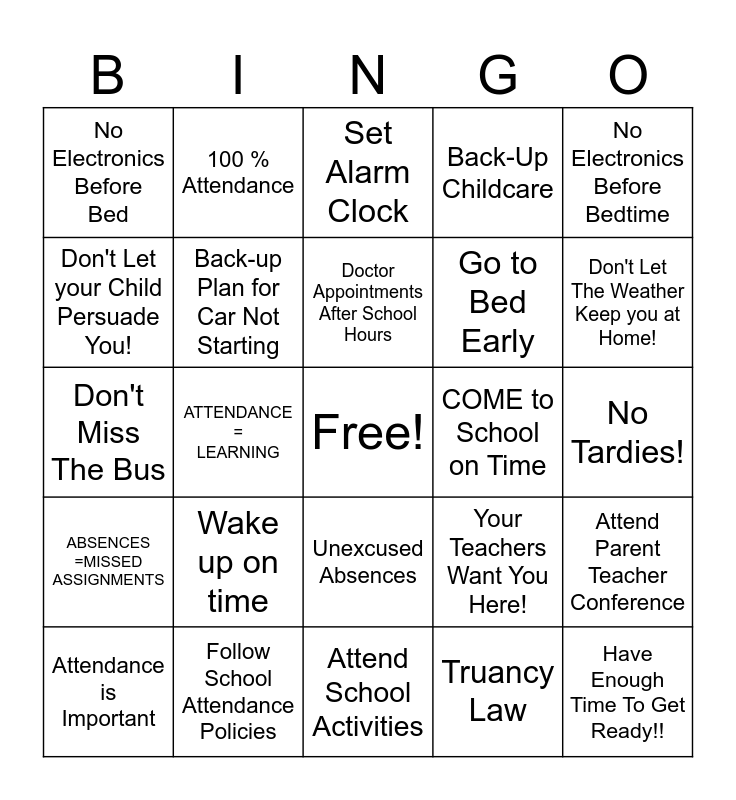 This bingo card has a free space and 24 words: Wake up on time, Follow School Attendance Policies, Doctor Appointments After School Hours, Attendance is Important, No Electronics Before Bedtime, No Electronics Before Bed, Don't Let your Child Persuade You!, 100 % Attendance, COME to School on Time, Unexcused Absences, Go to Bed Early, Don't Miss The Bus, Your Teachers Want You Here!, Attend Parent Teacher Conference, Back-up Plan for Car Not Starting, Truancy Law, No Tardies!, Set Alarm Clock, Don't Let The Weather Keep you at Home!, ATTENDANCE = LEARNING, Have Enough Time To Get Ready!!, ABSENCES =MISSED ASSIGNMENTS, Back-Up Childcare and Attend School Activities.