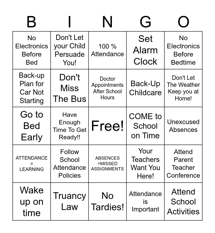 This bingo card has a free space and 24 words: Wake up on time, Follow School Attendance Policies, Doctor Appointments After School Hours, Attendance is Important, No Electronics Before Bedtime, No Electronics Before Bed, Don't Let your Child Persuade You!, 100 % Attendance, COME to School on Time, Unexcused Absences, Go to Bed Early, Don't Miss The Bus, Your Teachers Want You Here!, Attend Parent Teacher Conference, Back-up Plan for Car Not Starting, Truancy Law, No Tardies!, Set Alarm Clock, Don't Let The Weather Keep you at Home!, ATTENDANCE = LEARNING, Have Enough Time To Get Ready!!, ABSENCES =MISSED ASSIGNMENTS, Back-Up Childcare and Attend School Activities.