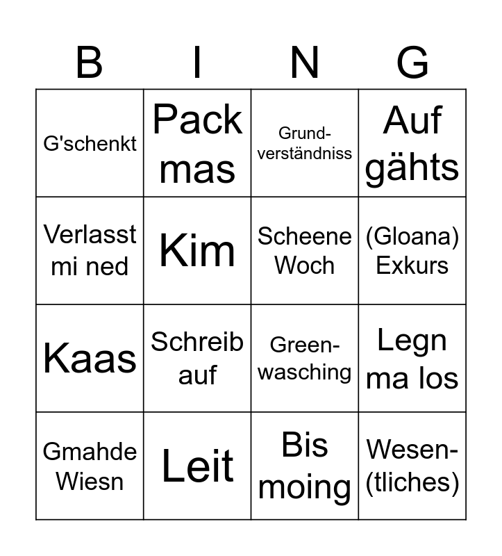 This bingo card has 16 words: Leit, Legn ma los, Grund-verständniss, G'schenkt, Kaas, Pack mas, Green-wasching, Bis moing, Verlasst mi ned, Kim, Gmahde Wiesn, Auf gähts, Schreib auf, (Gloana) Exkurs, Scheene Woch and Wesen- (tliches).