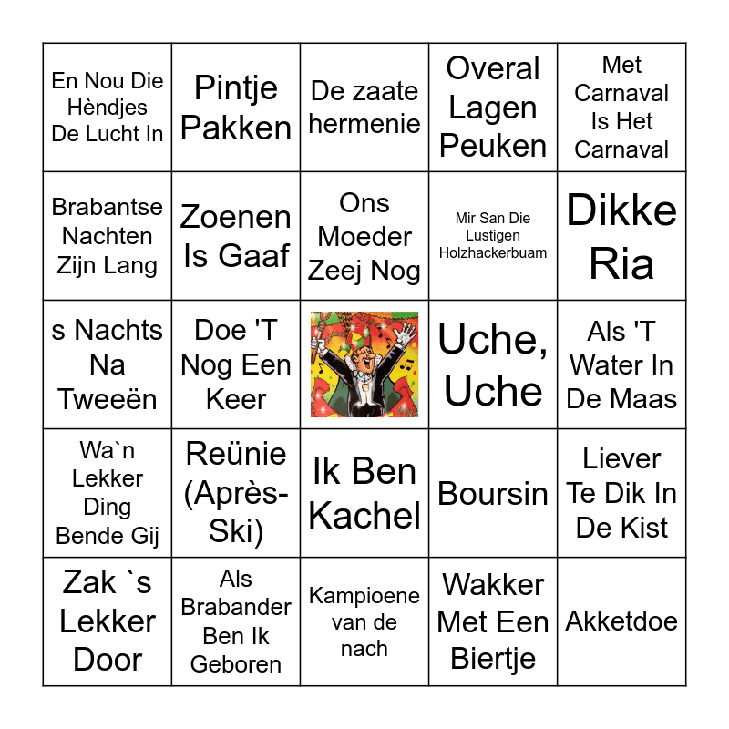 This bingo card has a free space and 75 words: Handjes Handjes Bloemetjesgordijn, Geef Mij De Liefde En De Gein, De zaate hermenie, Ik Kom Uit Brabant, Zwaaien En Zwieren, Wa ne gevel, De Rol Van De Behanger, Zak 's Lekker Door, Confetti in m`n bier, Kant Aan M'n Broek, Veer höbbe de prins in de sjtraot, Puntje D'rin Puntje D'ruit, Ons Moeder Zeej Nog, Brabantse Nachten Zijn Lang, Meh me lepke, Doe 'T Nog Een Keer, Bij Ons Staat Op De Keukendeur, Akketdoe, De Grozzie Van Mèn Buurvrouw, Met Carnaval Is Het Carnaval, Samen In Het Bubbelbad, s Nachts Na Tweeën, Zoenen Is Gaaf, Pintje Pakken, Overal Lagen Peuken, Zwemmen Zonder Slip, Zingend door Mestreech, Fijnfisjenie!, Trink Trink Brüderlein Trink, Eve e slukske, Ik Voel Me Helemaal Te Gek Vandaag, Brabo, Onze Ouwe Sint Jan, Boursin, Dikke Ria, Mir San Die Lustigen Holzhackerbuam, Soep Met Ballen, Onze Hond (Stinkt Uit Z'n Mond), Als 'T Water In De Maas, Wakker Met Een Biertje, In München Steht Ein Hofbräuhaus, Lalala Medley, Hé Jacqueline (waar is de vaseline), Hutje Op De Hei, Mijn Sanseveria, Unne Spijker In Munne Kop, Zak `s Lekker Door, En Nou Die Hèndjes De Lucht In, Houdt 'm Vast Katharina, Koekoek, Rosemarie Polka, Ik Ben Kachel, Kleine Blonde Mariandel, Sjeng Aon De Geng, Un Lekker Delleke, Nie Knieze, Nie Zeure, De Kantine, Roetewisser, Wat Zijn Ze Lekker, Doe 'n Stapje Naar Voren, Reünie (Après-Ski), Pakketje, Padellen, Da gif toch niks, En Van Je Hoempa, Uche, Uche, Met 50 Hoeft 't Leven Niet Voorbij Te Zijn, Cowboys & Indianen, De Fiets, Liever Te Dik In De Kist, Wa`n Lekker Ding Bende Gij, Als Brabander Ben Ik Geboren, Shotje, Baco, Biertje, Kampioene van de nach and Ik Ben Tamboer.