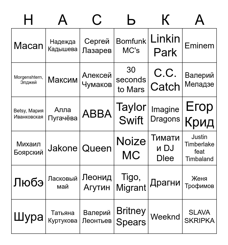 This bingo card has 36 words: Tigo, Migrant, Леонид Агутин, Britney Spears, Morgenshtern, Элджей, Михаил Боярский, Taylor Swift, Максим, Валерий Леонтьев, Linkin Park, Драгни, Валерий Меладзе, Bomfunk MC's, Женя Трофимов, Алла Пугачёва, 30 seconds to Mars, Macan, Любэ, Imagine Dragons, Betsy, Мария Иванковская, Сергей Лазарев, ABBA, Jakone, Noize MC, Queen, Тимати и DJ Dlee, Надежда Кадышева, C.C. Catch, Татьяна Куртукова, Алексей Чумаков, Eminem, SLAVA SKRIPKA, Шура, Justin Timberlake feat Timbaland, Егор Крид, Ласковый май and Weeknd.