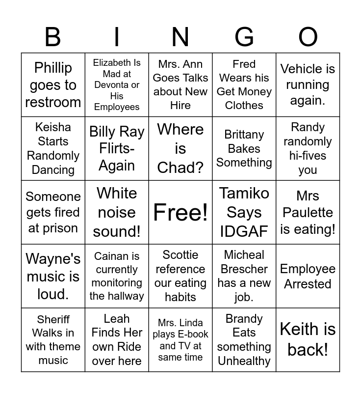 This bingo card has a free space and 28 words: Employee Arrested, Heather Ignores Telephone, Brittany Bakes Something, Brandy Eats something Unhealthy, Keisha Starts Randomly Dancing, Mrs. Ann Goes Talks about New Hire, Elizabeth Is Mad at Devonta or His Employees, Wayne's music is loud., Tamiko Says IDGAF, Sheriff Walks in with theme music, Someone gets fired at prison, Fred Wears his Get Money Clothes, Leah Finds Her own Ride over here, Mrs. Linda plays E-book and TV at same time, Randy randomly hi-fives you, Lynda searches for receipts, Cainan is currently monitoring the hallway, Billy Ray Flirts-Again, Where is Chad?, Scottie reference our eating habits, Phillip goes to restroom, Moley, Moley, Moley, Keith is back!, White noise sound!, Mrs Paulette is eating!, Micheal Brescher has a new job., Vehicle is running again. and Major has referred to someone as young man..