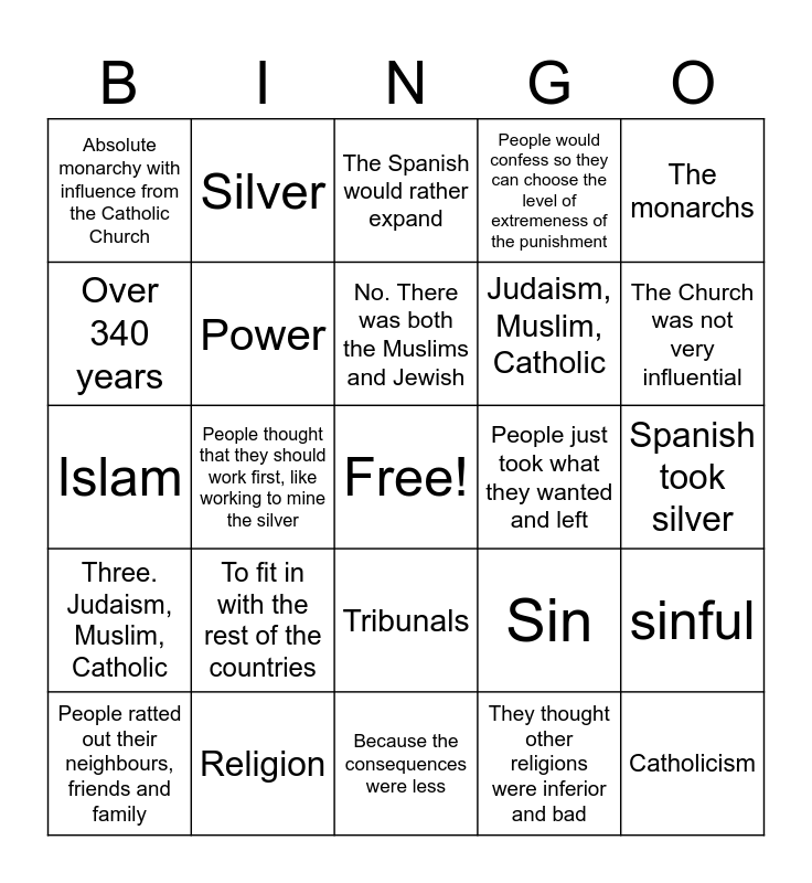 This bingo card has a free space and 24 words: To fit in with the rest of the countries, Religion, No. There was both the Muslims and Jewish, People ratted out their neighbours, friends and family, The monarchs, Absolute monarchy with influence from the Catholic Church, Over 340 years, Silver, People just took what they wanted and left, Tribunals, Judaism, Muslim, Catholic, Islam, Sin, sinful, Power, They thought other religions were inferior and bad, Spanish took silver, The Spanish would rather expand, The Church was not very influential, People thought that they should work first, like working to mine the silver, Catholicism, Three. Judaism, Muslim, Catholic, People would confess so they can choose the level of extremeness of the punishment and Because the consequences were less.
