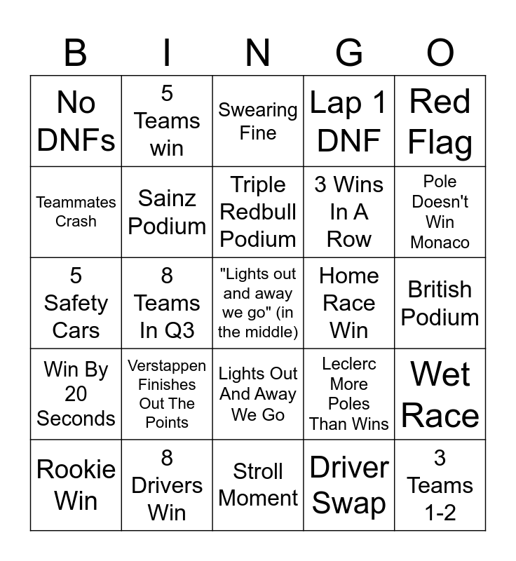 This bingo card has 26 words: Lights Out And Away We Go, Rookie Win, Sainz Podium, Verstappen doesn't win WDC, Lap 1 DNF, Red Flag, Teammates Crash, 5 Teams win, Triple Redbull Podium, Driver Swap, Pole Doesn't Win Monaco, 5 Safety Cars, 8 Drivers Win, Stroll Moment, Home Race Win, 3 Teams 1-2, No DNFs, Verstappen Finishes Out The Points, Swearing Fine, Leclerc More Poles Than Wins, British Podium, Win By 20 Seconds, 8 Teams In Q3, "Lights out and away we go" (in the middle), 3 Wins In A Row and Wet Race.