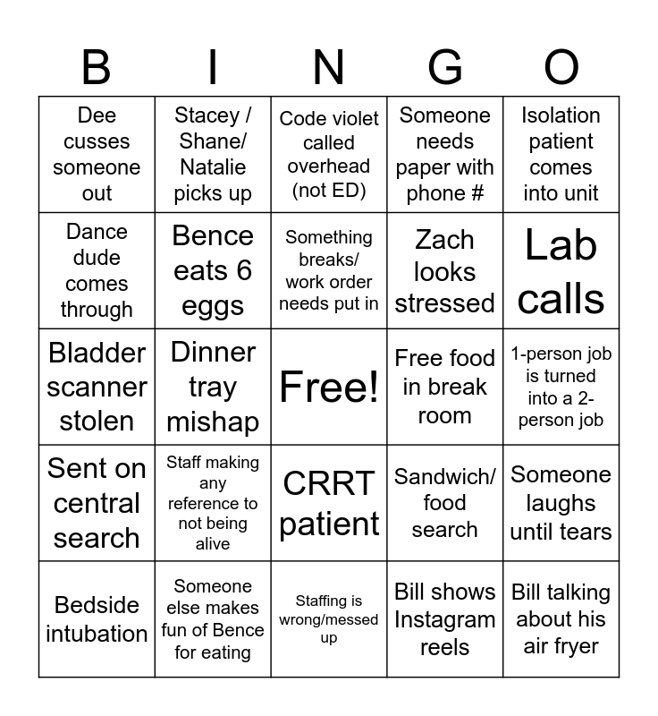 This bingo card has a free space and 33 words: Code blue called overhead, STEMI is called overhead, Something breaks/ work order needs put in, Expiration, 1-person job is turned into a 2-person job, Dee cusses someone out, Bence eats 6 eggs, Staffing is wrong/messed up, Zach looks stressed, Bill talking about his air fryer, Dance dude comes through, Stacey / Shane/ Natalie picks up, Bill shows Instagram reels, Open heart gone wrong, Bladder scanner stolen, Dinner tray mishap, CRRT patient, Sandwich/ food search, Someone laughs until tears, Sent on central search, Someone else makes fun of Bence for eating, Ultrasound IV, Someone needs paper with phone #, Lab calls, Bro is here, Staff making any reference to not being alive, Code violet called overhead (not ED), Free food in break room, Isolation patient comes into unit, Bedside intubation, UC gets bed, Labs need redrawn and Dirty joke is made.