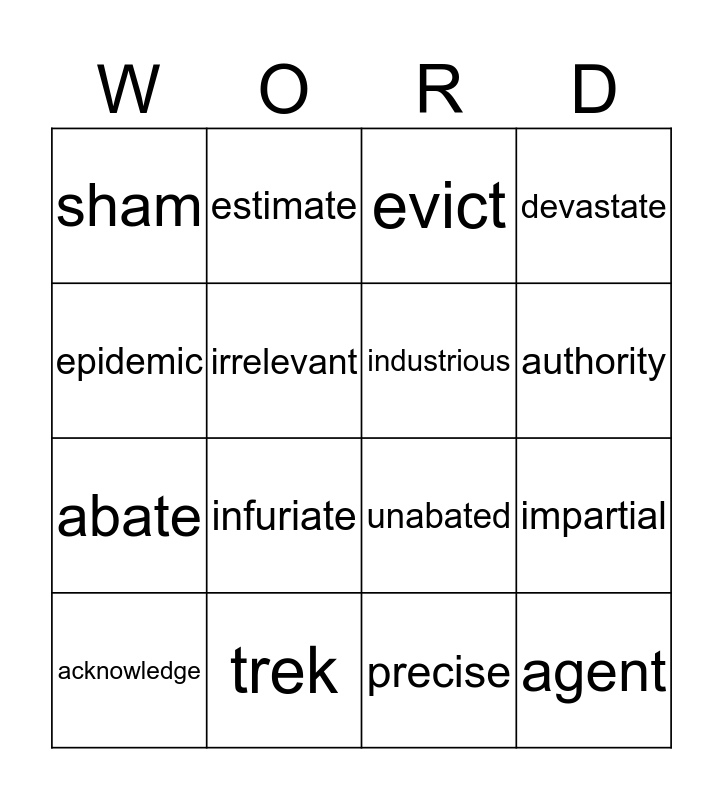 This bingo card has 16 words: trek, impartial, evict, sham, abate, estimate, unabated, precise, epidemic, irrelevant, acknowledge, devastate, infuriate, authority, industrious and agent.